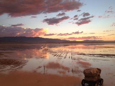 of town, the playa came into view. It looked… wet. There was a pretty sunset