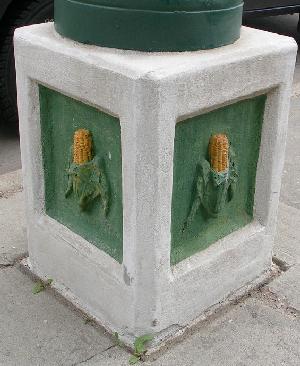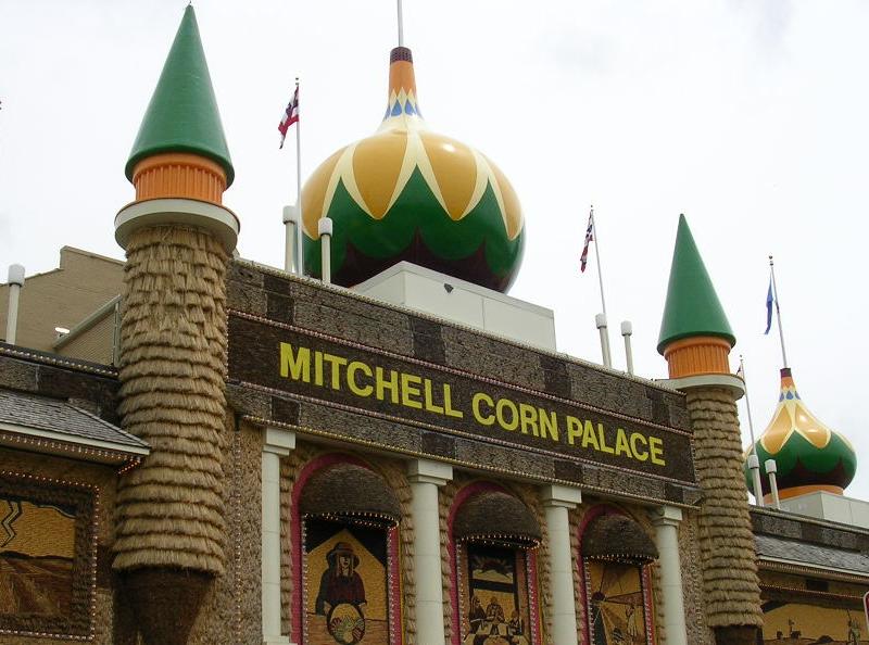 The first Corn Palace was built in 1892 as a showcase for all the crops grown in the area around Mitchell. It was also a slap back at Lewis & Clark, who wrote in their famous journals that nobody could ever make a living farming in that area. The idea took hold and grew, and there has been a Corn Palace in Mitchell ever since. Every year, thousands of bushels of corn and grain are used to decorate the Palace, which attracts a half million visitors each year. Inside, the Corn Palace is an autitorium. There's a stage on one end, but with a flat area directly in front big enough for a basketball court. When we were there, the court was taken over by a gigantic gift shop, but dozens of basketball games are played there every years by area schools. Zack and I got some souveniers and a crushed penny. The exterior is decorated with clever murals made of corn husks-- some very elaborate. The designs change every year. There was a monument across the street to Oscar Howe, the artist who made the exterior murals for decades. The main street has many 19-century buildings and is full of little shops and restaurants. One place was selling moon pie-type treats called "cow patties." Um, no thanks. We took some more pictures and hit the road. Time was marching on. It started to sprinkle again. |