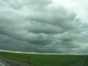 The highway led us into some cheerful rolling hills. The view to the west was speckled blue and grey, but it looked like some dark clouds were moving in. At the Irene exit, I saw a sign that said it was 65 degrees out. Blue skies peeked through the clouds as we approached Souix Falls, and we found a convenience store for a pit stop. |